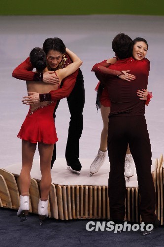 图为庞清/佟健与申雪/赵宏博拥抱庆祝。中新社发 盛佳鹏 摄