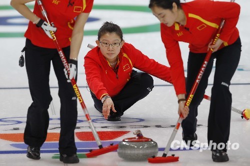 当地时间2月17日,去年夺得世锦赛冠军的中国女子冰壶队在温哥华冬奥赛场上首次亮相,初次体验冬奥会的紧张让她们的发挥受到影响,最终以4比5惜败于盐湖城冬奥会冠军英国队。图为中国队队员王冰玉(中)在比赛中。 中新社发 盛佳鹏 摄