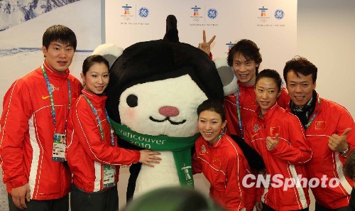 中国花样滑冰选手与温哥华冬奥会吉祥物合影