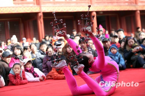 春节期间,北京东岳庙春节文化庙会上的演员们身手不凡,各怀绝技。他们为游客表演的“高车踢碗”、“抖空竹”、“变脸”、“柔术”等精彩杂技,令众多游客拍手称绝。中新社发 陈晓根 摄