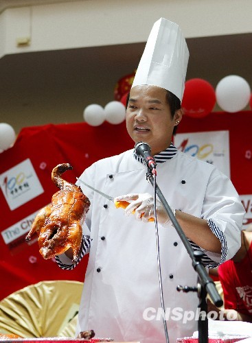 大厨用英文现场演示如何用微波炉做出中国烤鸭。中新社发 高周丹 摄