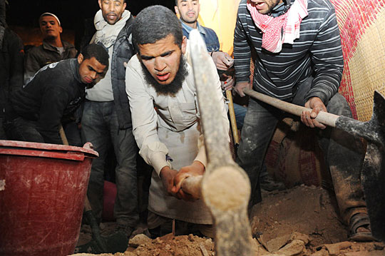 图为人们清理倒塌区域试图将受伤的人员救出。
