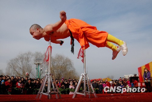2月18日,在第十届北京莲花池庙会“民间奇人绝技大舞台”,来自全国各地的奇人绝技高手为游客精彩表演。 中新社发 李文明 摄