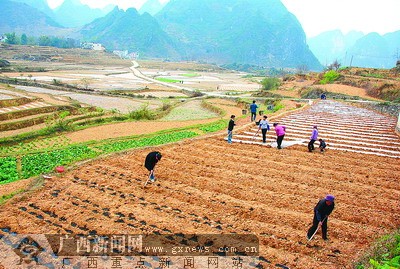 除夕刚过,东兰县灾区群众落实总理指示,积极开展生产自救,从山上到田间,农民们为树苗铲草、播种玉米,并大量推广地膜种植技术进行保水保温保肥,力争把去年的损失补回来。仅正月初一初二两天,该县就已完成春种玉米5000多亩。刘廷智 摄