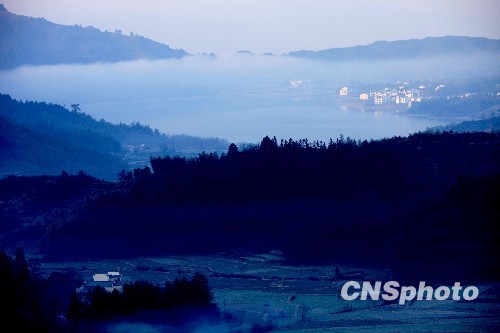 2010年2月20日早晨,雨后天晴,安徽黄山脚下黟县塔川出现罕见的“流云”景观。云烟袅绕,如梦似幻,宛如仙境。登高远眺塔川村落仿佛在云海中浮游,如似海市蜃楼。