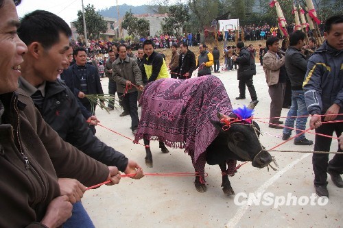 2月18日,在广西融水苗族自治县怀宝镇河村侗寨,苗、侗族同胞在高兴地吹芦笙、跳芦笙舞。当日,该县香粉乡雨卜苗寨到怀宝镇河村侗寨开展打同年活动。他们宰猪杀牛、跳芦笙舞、唱侗族大歌等,其乐融融。据悉,打同年是苗、侗等少数民族同胞在春节间村与村之间开展的一项友谊活动,在吹笙踩堂、打篮球等活动中,进一步促进民族间的交流和团结。