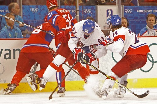 当地时间2月21日,2010年温哥华冬奥会男子冰球进入第6天的争夺,在小组赛中,B组的俄罗斯队(红)和捷克队相遇,俄罗斯4:2战胜捷克队。中新社发 盛佳鹏 摄