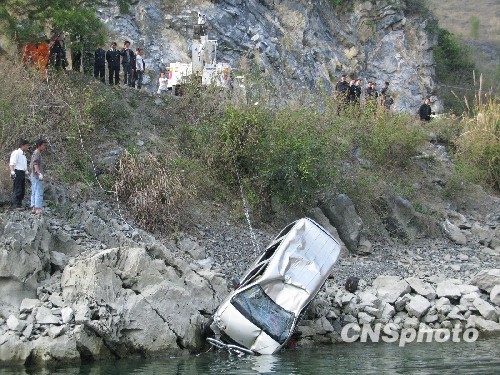 图为消防等救援人员将落水面包车打捞上岸。中新社发 黄宏 摄