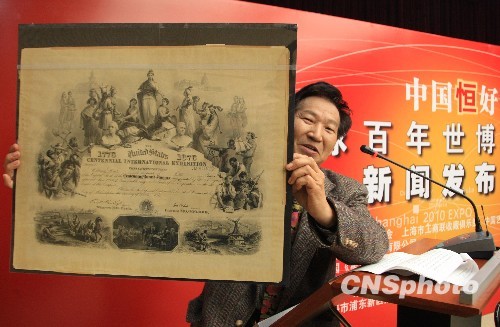 2月23日,一张1876年美国第一次为世博会发行的股票亮相上海。专程到上海举办《中国恒好全球百年世博收藏展》的美国华人收藏协会副会长乔文安表示,这张费城世博会珍罕股票的右上角绘有当时大清官员图案,证明了美国对中国参加世博会的重视。《中国恒好全球百年世博收藏展》2月26日将在上海开幕。中新社发 潘索菲 摄