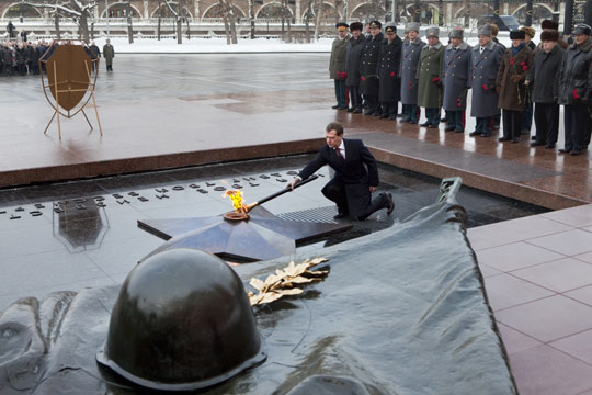 2月23日,俄罗斯祖国保卫者日,莫斯科举行隆重仪式,将临时迁移到反法西斯战争胜利纪念馆的长明火迎回到位于克里姆林宫红墙外的无名烈士墓。俄总统梅德韦杰夫与总理普京等政要以及部队军官和老战士代表等出席了点火仪式。