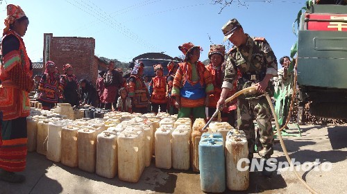 图为驻云南省蒙自县的武警部队为山区灾民们送去生活饮用水。中新社发 薛云 摄