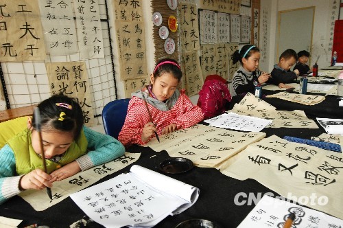 临近新学期开学,山东淄博市张店区中小学生为在新学期展示自己寒假学习的特长,纷纷到书法、美术等专业学校进行特长的学习和训练,以期在新学期加强自身素质的全面发展。