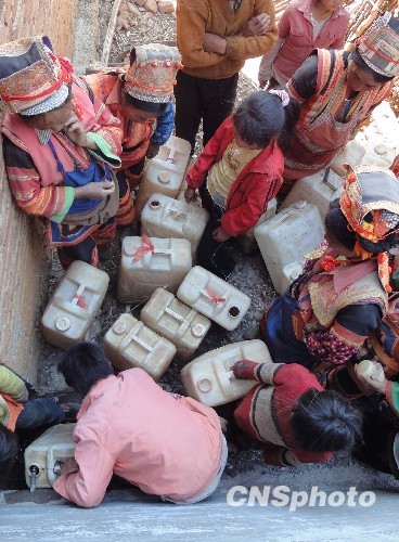 。图为在云南蒙自西北勒乡他期口村委会,当地武警部队将饮用水注到蓄水池中,村民们排队取水。中新社发 薛云 摄