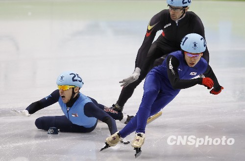 当地时间2月24日,2010年温哥华冬奥会短道速滑男子500米预赛在温哥华太平洋体育馆进行,美国选手MALONE Jordan在比赛中失误摔倒。