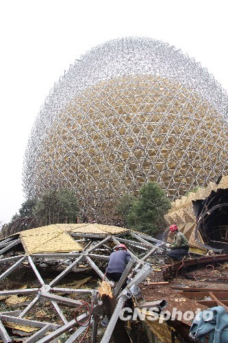 2月25日,工人在拆除江苏镇江“巨蛋”。镇江“世纪巨蛋”曾经一夜走红,名噪一时,风光无限。然而在其相关人员涉嫌诈骗被司法机关依法追究刑事责任后,“巨蛋”搁浅,并于近日黯然退出历史舞台,将在拆除原址上将新建起集餐饮、休闲、购物、娱乐于一体的商业设施。1999年建于原镇江21世纪乐园内的“巨蛋”,曾是镇江的一个标志性建筑,并作为新千年庆典的分会场,使之一夜走红。“巨蛋”高48米,最大直径38米,与地面倾斜达23.5度,“蛋壳”内嵌着一个直径达28米的“蛋黄”。由于“巨蛋”内部没有一根支柱和横梁,全凭自身牵引力达到平衡支撑。建设搁浅后,逐渐成为盲流人员的暂住地,且酿成了数次火灾。经权威鉴定,‘巨蛋’存在结构性安全隐患。