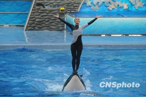 图为4个多月前记者在奥兰多海洋世界拍摄的训练员与虎鲸的表演时的画面。中新社发 吴庆才 摄