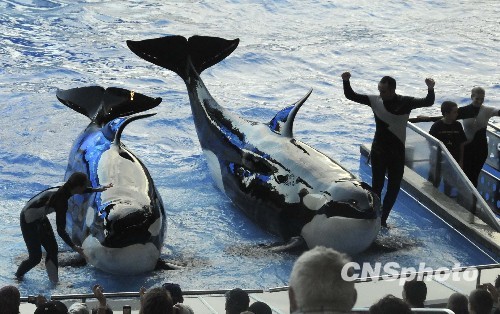 图为4个多月前记者在奥兰多海洋世界拍摄的训练员与虎鲸的表演后向观众致敬的画面。中新社发 吴庆才 摄