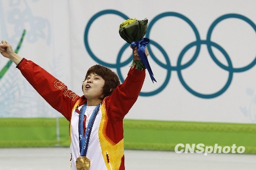 当地时间2月26日,中国选手王濛在2010年温哥华冬奥会短道速滑女子1000米的决赛中摘得金牌,成绩是1分29秒213。另一名中国选手周洋被取消了成绩。至此,中国短道速滑女队包揽了本届冬奥会女子全部四个项目的金牌,成为第一个囊括女子短道速滑全部4枚金牌的队伍。中新社发 盛佳鹏 摄