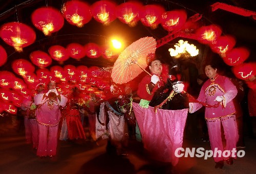 2010年2月27日晚,天津一年一度的元霄节“沽上春好”大型灯会亮灯,鸿运大道上色彩斑斓、梦幻般的“灯海”、欢乐祥和的民间艺术表演,吸引了游客的目光。中新社发 李胜利 摄