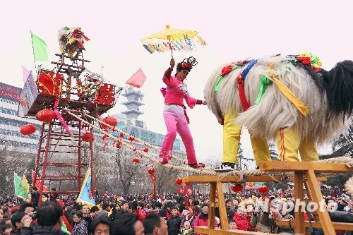 2010年2月27日,来自郑州市各区的民间舞狮等表演队伍云集绿城广场,为郑州市民献上了一台丰富的节目。中新社发 郑劲松 摄