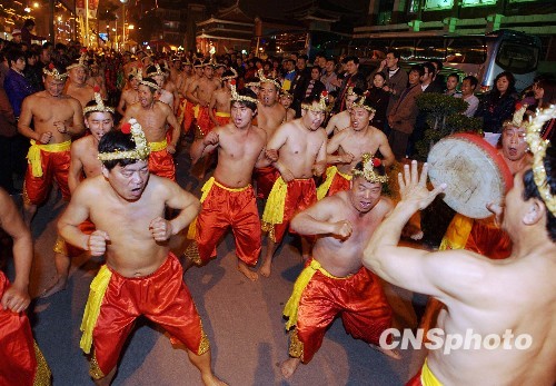 2月28日晚,盛行于泉州,流传于闽台的国家非遗民俗“拍胸舞”在泉州热闹踩街。当晚,借着首届海峡两岸闽南文化节的契机,泉州市开展了丰富多彩的民俗踩街闹元宵活动,闽南文化特色的民俗表演吸引大批游客、当地市民前往观看。中新社发 张丽君 摄