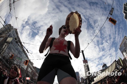 当地时间2月28日,加拿大球迷在温哥华街头庆祝加拿大队男子冰球队夺得金牌。中新社发 盛佳鹏 摄