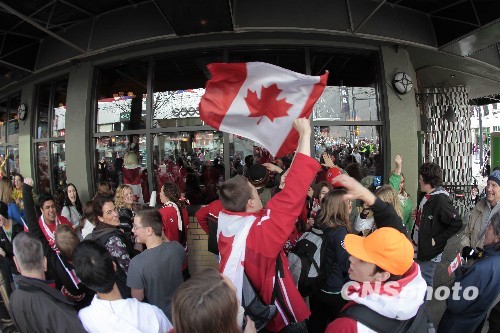 当地时间2月28日,加拿大球迷在温哥华街头庆祝加拿大队男子冰球队夺得金牌。中新社发 盛佳鹏 摄