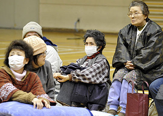 2月28日,在日本宫城县,接到海啸警报的居民聚集在一处临时住所等待消息。