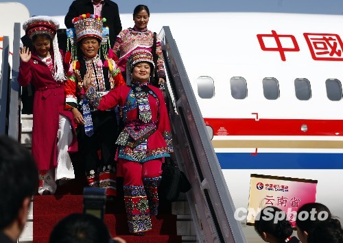图为云南代表团的少数民族代表盛装抵京。中新社发 杜洋 摄