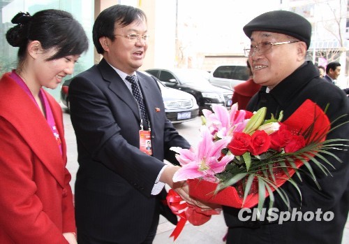 3月2日,参加全国两会的安徽省委书记王金山抵达中国职工之家酒店。中新社发 杜洋 摄