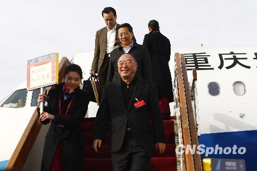3月2日,参加全国两会的代表、委员陆续抵达北京。图为重庆市代表团抵京,市长黄奇帆走下飞机。中新社发 杜洋 摄