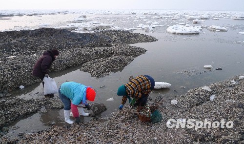 市民在岸边拾贝。中新社发 刘德斌 摄