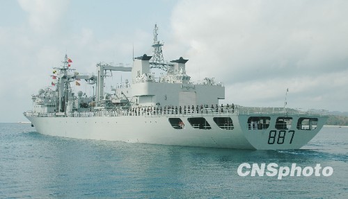 图为“微山湖”舰缓缓驶离军港。中新社发 尹海明 摄