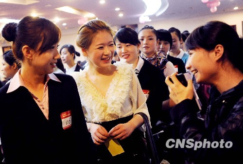 3月4日,来自福建各地的年轻女性在深圳航空有限公司设在福州的乘务员招聘现场接受初试,期望能跨入“空姐”的行列。