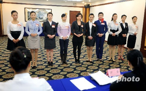 3月4日,来自福建各地的年轻女孩在深圳航空有限公司设在福州的乘务员招聘现场接受初试,期望能跨入“空姐”的行列。中新社发 刘可耕 摄