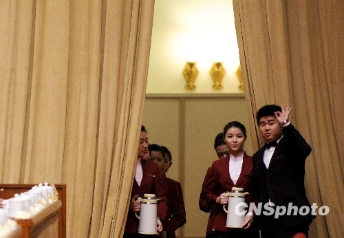 3月7日,全国政协十一届三次会议第二次全体会议在北京人民大会堂举行,主席台上的服务员以手势倒数“3、2、1”来指挥女服务员加水服务,精确到秒。