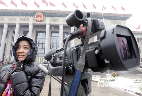 3月8日上午,一场大雪令北京气温骤降,来自南方的女记者全副武装,在人民大会堂前等待采访参加十一届全国人大三次会议的代表。中新社发 张宇 摄