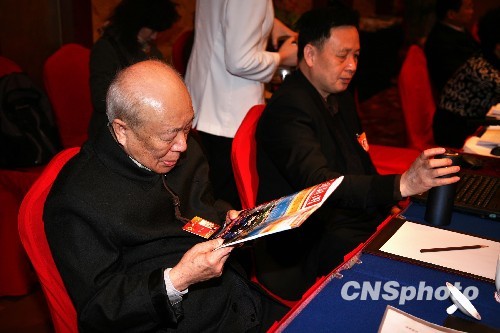 全国政协委员、著名书法家欧阳中石关注《中国新闻》。中新社发 王保胜 摄