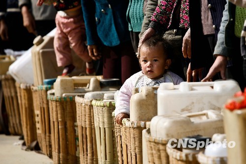 图为云南省富源县小羊场村,1名儿童随母亲来到村口排队取水。中新社发 保旭 摄