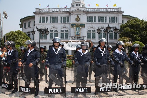 图为驻守在红衫军集会示威主会场曼谷潘帕桥旁的军警,烈日炎炎下坚守岗位。中新社发 顾时宏 摄