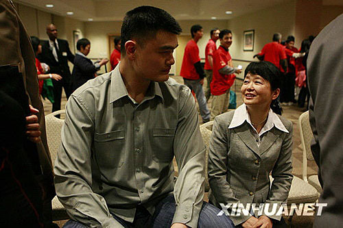 3月13日,火箭队球员姚明与姚明球迷俱乐部成员合影。当日,在休斯敦火箭队主场迎战新泽西网队的比赛前,姚明在火箭队的荣誉室与300多位姚明球迷俱乐部成员见面并合影留念。