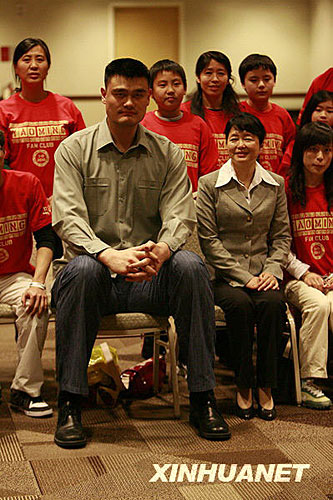 火箭队球员姚明与姚明球迷俱乐部成员合影。