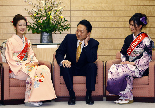 2010年3月15日,日本首相鸠山由纪夫当日在东京首相官邸接见了2010年度“日本小姐”Mina Hayashi和“和服小姐”Aimi Azuma。