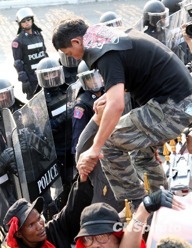 泰国红衫军高举收集的血液洒向总理府外(4)