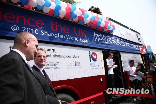 图为英国驻重庆领事馆官员在英国世博大巴前介绍上海世博英国馆。中新社发 张浪 摄