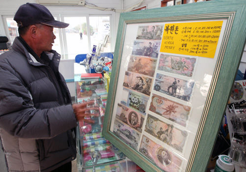 2009年12月1日,韩国坡州,一名游客在看作为旅游纪念品出售的朝鲜货币。