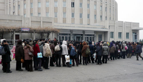 当地时间2009年11月20日,朝鲜平壤,民众在卫生站外排队。