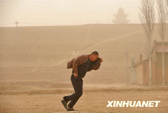 宁夏海原县李旺镇杨山村,一名村民在风沙中前行。王鹏 摄