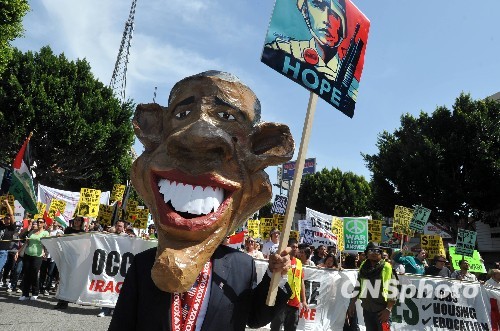 图为一名抗议者丑化奥巴马总统,抗议他至今没有下令美军撤出伊拉克。中新社发 张炜 摄