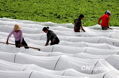 2010年3月20日,四川广安市武胜县飞龙镇农民在田间给刚覆盖在苗床上的薄膜压边土。广安市自去冬以来雨量偏少,加上连日气温持续偏高,旱情加重。为不误农时,广安市启动抗旱应急预案,积极组织人力、财力、物力,千方百计保证农业用水,抢时春播春种,保证农民增收。 中新社发 邱海鹰 摄